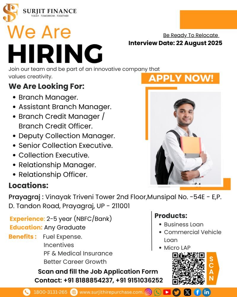 Surjit Finance Walk-in Interview 2025: Surjit Finance is hiring for multiple positions including Branch Manager, Assistant Branch Manager, Branch Credit Manager/Officer, Deputy Collection Manager, Senior Collection Executive, Collection Executive, Relationship Manager, and Relationship Officer. Candidates with 2–5 years of experience in NBFC/Bank can apply. Interested candidates can attend the walk-in interview on the scheduled date. Complete details are given below.